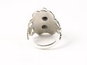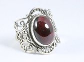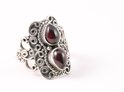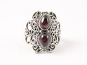 Handgemaakte en fijn bewerkte zilveren ring met twee mooie cabochon geslepen granaat stenen. Het zilvergehalte is 925.