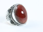 Handgemaakte en fijn bewerkte zilveren ring met twee mooie cabochon geslepen granaat stenen. Het zilvergehalte is 925. De ring is verkrijgbaar in ringmaat 18.