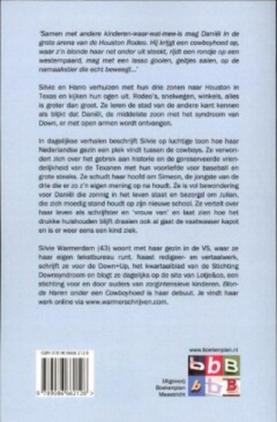 'Blonde haren onder een cowboyhoed' geeft een nieuw inzicht in het leven van een expatgezin in de VS. Nu eens niet de kritische verbazing over de oppervlakkigheid aldaar, maar een optimistische blik gevoed door haar ervaring dat je daar ook als gezin met een kind met een verstandelijke beperking, in tegenstelling tot wat veelal in Nederland gebeurd, volledig wordt opgenomen in de samenleving. In bondige columns biedt Warmerdam in heldere taal en niet zonder humor, een ander en vooral origineel perspectief op het leven in de VS en de veelal positieve invloed daarvan op haar gezin. Zeker niet alleen voor (toekomstige) expats en/of mensen met een kind met Down-syndroom een aanrader!
