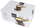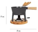 De Fondueset Pro heeft een stoere en stijlvolle uitstraling. In de gietijzeren pan met houten handvat past 875 gram gesmolten kaas. De set is compleet met onderstel, brander (exclusief brandvloeistof) en vier fonduevorken. De mooie verpakking maakt deze set erg geschikt om cadeau te doen.