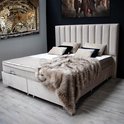 Boxspring Leonar 160x200 cm met opbergruimte heeft een bekleding van velvet stof beige waarbij het hoofdbord verticaal geblokt is en bestaande uit 2 delen. Verder is het model voorzien van twee ruime opberg boxen welke dankzij de gasveermechanisme gemakkelijk te openen zijn. Boxspring wordt geleverd inclusief een luxe pocketgeveerde 360 matras met een vaste integreerde topper.(zie afbeeldingen) Het matras is meegestoffeerd in velvet beige en heeft een dikte van ca. 27 cm.