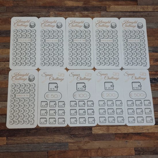 Deze kaarten zijn een leuke en effectieve manier om geld te sparen. Elke kaart heeft een vakje voor een specifiek bedrag, en je vult de kaartjes in met cash geld. Als alle vakjes gevuld zijn, heb je je spaardoel behaald!