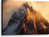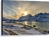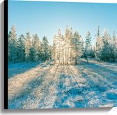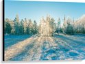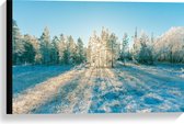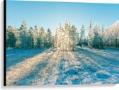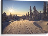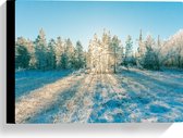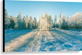 Canvas - Ochtend Zonnestralen over Wit Sneeuwlandschap - 100x75 cm Foto op Canvas Schilderij (Wanddecoratie op Canvas)