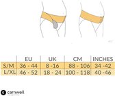 Meet je maat door de centimeter op hoogte van het holletje in je onderrug, onder je buik door te meten.