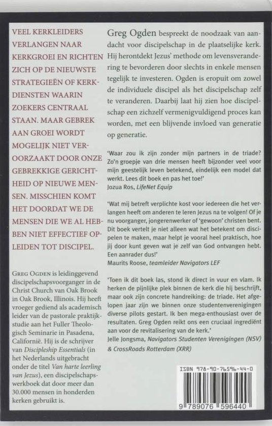 Greg Ogden bespreekt de noodzaak van aandacht voor discipelschap in de plaatselijke kerk. Hij herontdekt Jezus' methode om levensverandering te bevorderen door slechts in enkele mensen tegelijk te investeren. Ogden is eropuit om zowel de individuele discipel als het discipelschap zelf te veranderen. Daarbij laat hij zien hoe discipelschap een zichzelf vermenigvuldigend proces kan worden, met een blijvende invloed van generatie op generatie.