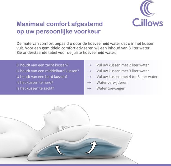 Wil je een fijn hoofdkussen kopen? Koop dan dit orthopedische waterkussen in de afmeting 60x70 cm of 40x80 cm! Door het unieke water-compartiment past het waterkussen zich perfect rond de nek aan. Daardoor wordt een optimale ondersteuning van je nek en hoofd verkregen wat resulteert in een natuurlijke uitlijning van de wervelkolom. Dit kan o.a. nekklachten, rugklachten, hoofdpijn en snurken voorkomen of verminderen. Met dit heerlijke waterkussen van Cillows geniet je van een heerlijke nachtrust waardoor je energiek aan de dag begint!