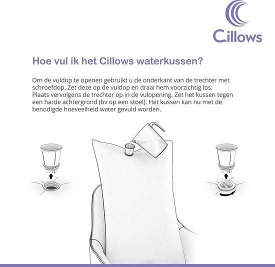 Om dit heerlijke waterkussen van Cillows te vullen gebruik je als allereerst de onderkant van de trechter met schroefdop. Zet deze op de vuldop en draai hem voorzichtig los. Plaats vevolgens de trechter in de vulopening. Zet het kussen tegen een harde achtergrond (een stoel bijvoorbeeld). Het kussen kan nu met de benodigdfe hoeveelheid water gevuld worden.