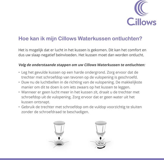 Door het kussen met de juiste hoeveelheid water te vullen is deze perfect af te stemmen op je eigen wensen. Let wel op dat je de schroefdraad van de vulopening met het bijgeleverde "Tape" afdicht om lekkage te voorkomen.