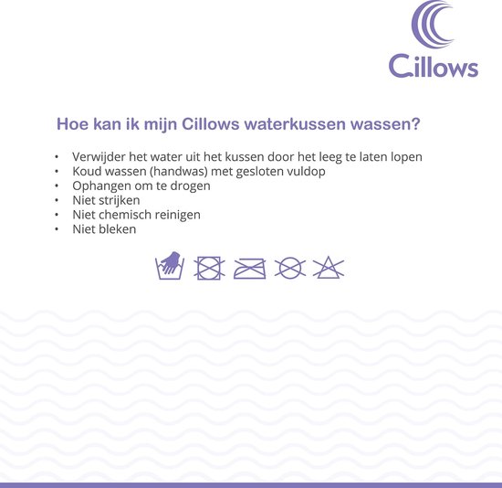 Dit waterkussen mag niet gebleekt of chemisch gereinigd worden. Het is wel mogelijk om dit waterkussen op de volgende manier te wassen:
