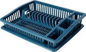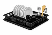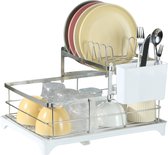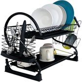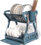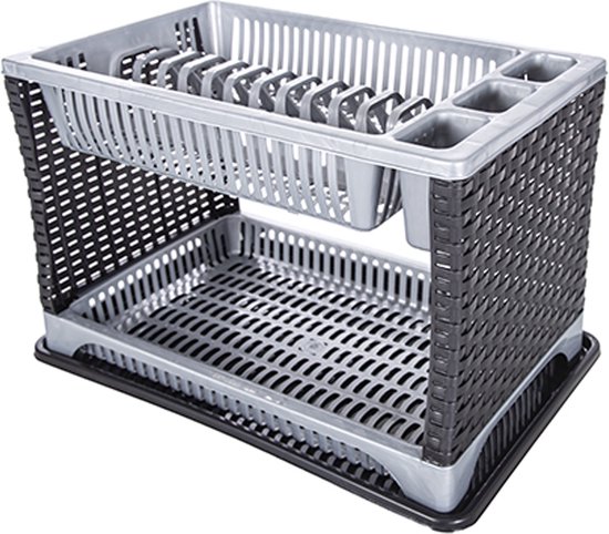 Afdruiprek met 2 lagen voor natte afwas, gemaakt van kunststof in de kleur grijs rotan. Dit druiprek is geschikt voor het uitlekken van borden, glazen, bekers, bestek en dergelijke. Formaat: 44 x 30 x 27 cm. Geschikt voor 12 borden. Materiaal: kunststof. Voor thuis en op de camping. Verschillende rekjes, haakjes en compartimenten.