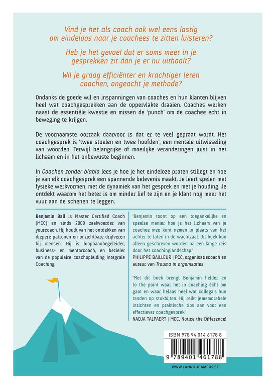 In Coachen zonder blabla lees je hoe je het eindeloze praten stillegt en hoe je van elk coachgesprek een spannende belevenis maakt. Je leert spelen met fysieke werkvormen, met de dynamiek van het gesprek en met je houding. Je ontdekt waarom het beter is om minder lief te zijn en je klant nog meer het vuur aan de schenen te leggen.