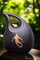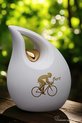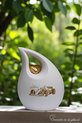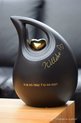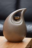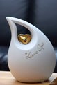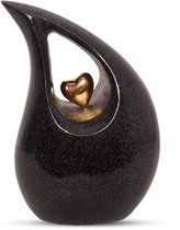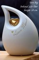 Deze schuine traan urn heeft een inhoud voor 3,8 liter. De urn is een groot model, 28 cm hoog en geschikt voor een as bestemming van het crematie-as van een volwassen mens.Er is een goud metallic metalen hartje geplaatst op de keramieke urn. Dit metallic gouden hartje zit vast op de urn!