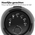 De airfryer is gemaakt van zwart glanzend kunststof en staat daarom goed in iedere keuken. De airfryer heeft twee draaiknoppen aan de voor- en bovenkant waarmee deze bediend kan worden. Daarnaast staan aan de bovenkant afbeeldingen verschillende gerechten (o.a. vlees, vis en friet) en daarbij de temperatuur en het aantal minuten waarop het gebakken moet worden. Dit hoef je van tevoren dus niet meer op te zoeken, en hierdoor wordt het maken van eten nog gemakkelijker!