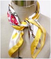 Dames neksjaal Aafke in fantasiemotief in de kleuren oranje, beige, bruin, geel, abrikoos en rotan goud. Vierkant model. De sjaal is gemaakt van 80% polyester en 20% zijde. U kunt de sjaal ook gebruiken als halssjaal, haarband of ter versiering van uw tas. De lengte van de sjaal is 70 cm, de breedte van de sjaal is 70 cm.