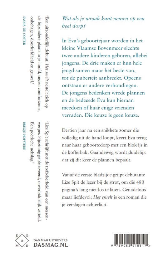 Vanaf de eerste bladzijde grijpt debutante Lize Spit de lezer bij de strot, om die tot het eind niet los te laten. Genadeloos maar liefdevol: Het smelt is een roman die je verslagen achterlaat.