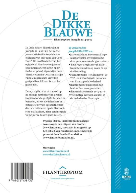 De Dikke Blauwe, Filanthropium Jaargids 2014-2015 is een uitgave van Lenthe (www.lenthe.nl), specialist in uitgaven op het gebied van filantropie, mede mogelijk gemaakt door Lenthe Foundation (www.lenthefoundation.nl).