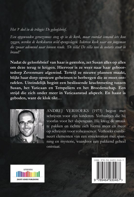 Het 3e deel in de trilogie: De geloofsbrief. Een opgewonden geroezemoes steeg op in de kerk, maar voordat iemand iets kon zeggen, werden de kerkdeuren wild opengeslagen. Iedereen keek naar een jongeman die zwaar ademend naar binnen rende. ‘De villa! De villa van de notaris staat inbrand!’ Nadat de geloofsbrief van haar is gestolen, zet Susan alles op alles om deze terug te krijgen. Hiervoor is ze weer naar haar geboortedorp Zevenmare afgereisd. Terwijl ze nieuwe plannen maakt, blijkt haar dorp opnieuw geheimen te herbergen die ze moet ontrafelen. Uiteindelijk begint een beslissende krachtmeting tussen Susan, het Vaticaan en Tempeliers en het Broederschap. Een strijd die zich onder meer in Vaticaanstad afspeelt. En haast is geboden, want de klok tikt… ANDREJ VERHOEKS (1975) begon met schrijven voor zijn kinderen. Verhaaltjes die hij voorlas voor het slapengaan. Hij kreeg de smaak te pakken en richtte zich hierna meer en meer op schrijven voor volwassenen. Verhoeks combineert elementen van een streekroman met spanning en mysterie, waardoor een pakkend geheel ontstaat.