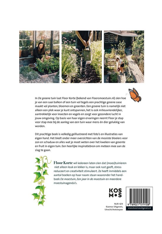 Na het succesvolle boek ‘De moestuin’, laat Floor Korte (bekend van Floorsmoestuin.nl) in ‘De groene tuin’ zien hoe je van een saai balkon of een tuin vol tegels een prachtige groene plek maakt. Op basis van haar eigen ervaringen, neemt ze je stap voor stap mee bij het aanleggen van een tuin waar mens én dier gelukkig van worden. Want hoe bouw je een schuurtje of een insectenhotel? En welke planten doen het goed op welke plek? Ze vertelt over de mooiste bloeiers, het kweken van groente en fruit in eigen tuin en het belang van insecten. Volledig geïllustreerd met veel foto’s en illustraties is dit een prachtig en inspirerend boek om mee aan de slag te gaan.