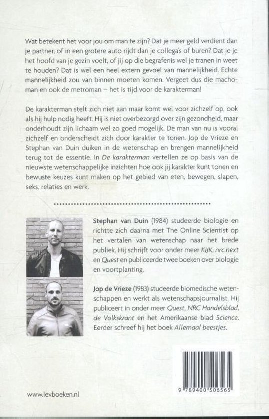 Allemaal praktische vragen waar mannen mee zitten, maar zelden over praten. Dat is zonde. Want iedere man heeft er wat aan om zich zo nu en dan bezig te houden met zijn gezondheid en met zijn functioneren in het dagelijks leven. En om daarbij karakter te tonen wanneer dat nodig is om zijn lifestyle vol te houden of aan te passen. In De karakterman laten Stephan van Duin en Jop de Vrieze zien hoe ook jij je kunt ontwikkelen op de belangrijkste vlakken van je leven: slaap en ritme, werk en ontplooiing, lichaam en beweging, vrienden en familie, eten en drinken en lust en liefde.