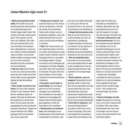In 'De kracht van duurzaam veranderen' biedt Anne-Marie Rakhorst organisaties de helpende hand. Ze voerde gesprekken met CEO's van nationale en internationale bedrijven, met visionairs uit overheid en wetenschap, en met economen. Aan de hand van hun visies, sprekende voorbeelden, oplossingen en best practices beantwoordt zij de centrale vraag: Hoe verduurzaam ik mijn organisatie?