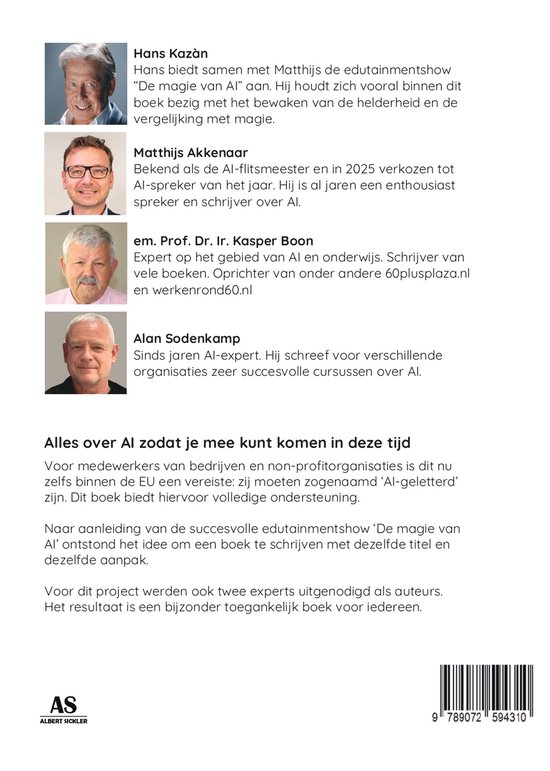 Eenvoudig en praktisch uitgelegd! Straks ben jij ook Ai-geletterd. Voor alle medewerkers van bedrijven en non-profitorganisaties die werken met AI is de basiskennis rondom AI zelfs een vereiste. De reden is de Ai-verordening oftewel de EU AI-Act. Ook de medewerkers in Nederland moeten AI-geletterd zijn. Dit boek biedt hiervoor volledige ondersteuning. AI Flitsmeester Matthijs Akkenaar en entertainer, spreker en ondernemer Hans Kazàn presenteren edutainment op topniveau met hun unieke combinatie die leren leuk maakt! De verrassingen binnen deze edutainmentshow zijn krachtig en maken dat je de aangereikte handvatten niet snel zal vergeten. De magie van AI zorgt ervoor dat mensen wijzer en met een glimlach de zaal zullen verlaten. Naar aanleiding van de succesvolle edutainmentshow ontstond het magische idee om dit boek te schrijven met dezelfde titel en vergelijkbare aanpak. Voor dit project werden ook twee experts uitgenodigd als auteurs met als doel een bijzonder toegankelijk boek voor iedereen. Gaat het de auteurs lukken om samen met Hans Kazàn de lezers met een glimlach iets wijzer te maken rondom AI?