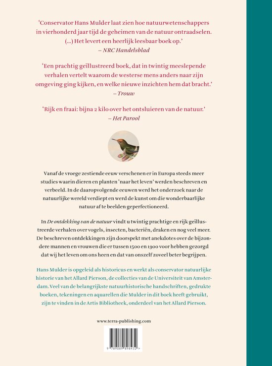 In De ontdekking van de natuur vindt u twintig prachtige en rijk geïllustreerde verhalen over vogels, insecten, bacteriën, draken en nog veel meer. De beschreven ontdekkingen zijn doorspekt met anekdotes over de bijzondere mannen en vrouwen die er tussen 1500 en 1900 voor hebben gezorgd dat wij het leven om ons heen en dat van onszelf zoveel beter begrijpen. Lees over de draak die in 1572 op een akker bij Bologna werd verslagen, over Van Leeuwenhoek, die met behulp van de door hemzelf gemaakte microscoop bacteriën in zijn eigen tandplak ontdekte. Of over hoe de jonge Charles Darwin tijdens zijn reis met de Beagle inzichten kreeg die de basis legden voor zijn evolutieleer.