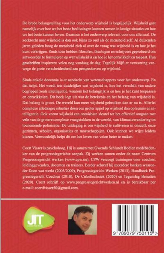 De brede belangstelling voor het onderwerp wijsheid is begrijpelijk. Wijsheid gaat namelijk over hoe we het beste beslissingen kunnen nemen in lastige situaties en hoe we het beste kunnen leven. Daarmee is het onderwerp relevant voor ons allemaal. De zoektocht naar wijsheid is dan ook bijna zo oud als de mensheid zelf. Al duizenden jaren geleden boog de mensheid zich al over de vraag wat wijsheid is en hoe je het kunt verkrijgen. Sinds toen hebben filosofen, theologen en schrijvers geprobeerd om antwoorden te formuleren op wat wijsheid is en hoe je het ontwikkelt en toepast. Hun geschriften inspireren velen nog vandaag de dag. Tegelijk blijft er verwarring vanwege de grote verscheidenheid aan perspectieven op wijsheid. Sinds enkele decennia is er aandacht van wetenschappers voor het onderwerp. En dat helpt. Het wordt iets duidelijker wat wijsheid is, hoe het verschilt van andere begrippen zoals intelligentie, waarom het belangrijk is en hoe je het kunt toepassen en ontwikkelen. Dit boek legt uit wat de betekenis en het belang van wijsheid is. Dat belang is groot. De wereld kan meer wijsheid gebruiken dan er nu is. Allerlei complexe alledaagse situaties doen een groter appel op wijsheid dan op kennis en intelligentie. Ook vormt wijsheid een onmisbare sleutel tot het effectief omgaan met vele van de grotere complexe vraagstukken in de wereld, van klimaatverandering tot toenemende polarisatie. De uitdaging is om wijsheid te cultiveren in onszelf, onze gezinnen, scholen, organisaties en maatschappijen. Ook kunnen we wijze leiders kiezen. Vermoedelijk helpt dit om het leven van velen beter te maken. Coert Visser is psycholoog. Hij is samen met Gwenda Schlundt Bodien medebedenker van de progressiegerichte aanpak. Zij werken samen onder de naam Centrum Progressiegericht werken (www.cpw.nu). CPW verzorgt trainingen voor coaches, leidinggevenden, docenten en trainers. Eerder schreef hij meerdere boeken waaronder Doen wat werkt (2005/2009), Progressiegericht Werken (2013), Handboek Progressiegericht Coachen (2018), De Cirkeltechniek (2020) en Tegenslag Benutten (2020). Coert schrijft op www.progressiegerichtwerken.nl en is bereikbaar per e-mail: coertfvisser50@gmail.com.