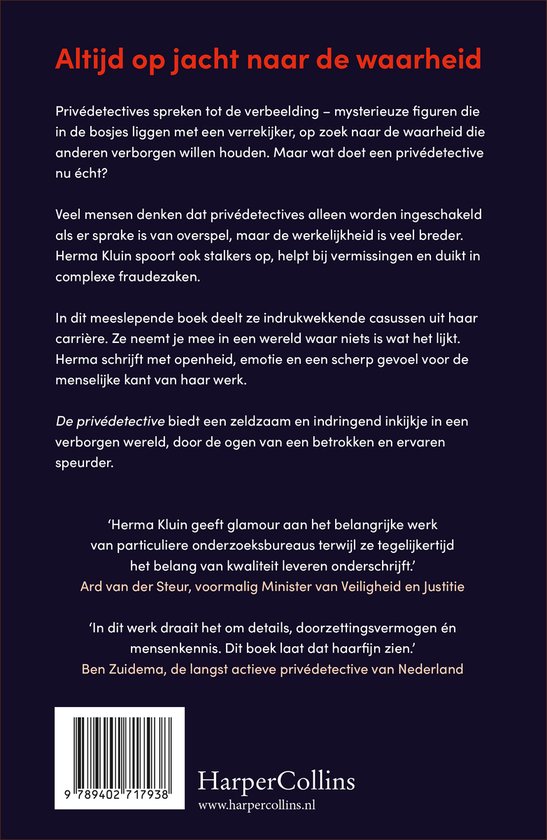 In dit meeslepende boek deelt ze indrukwekkende casussen uit haar carrière. Ze neemt je mee in een wereld waar niets is wat het lijkt. Herma schrijft met openheid, emotie en een scherp gevoel voor de menselijke kant van haar werk.