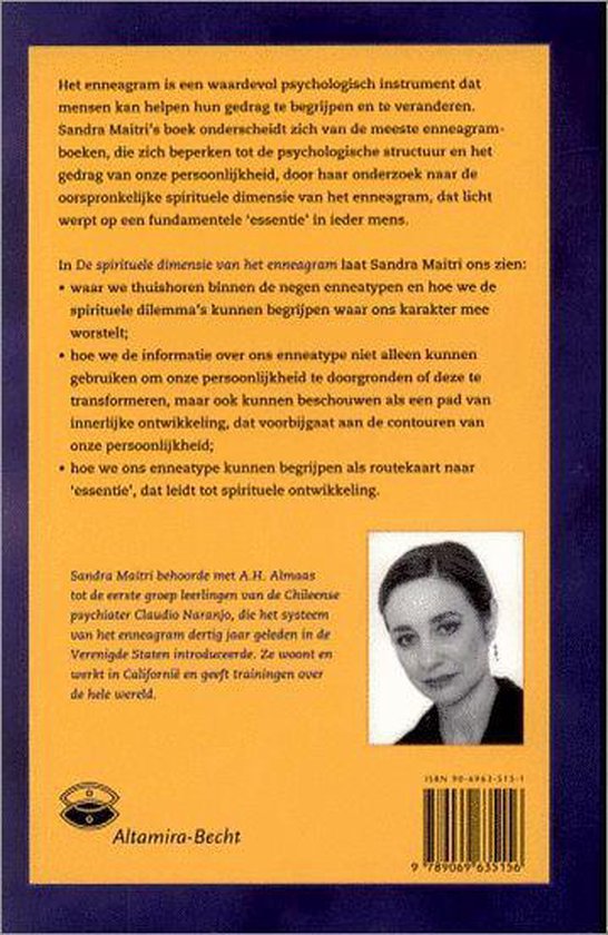 In 'De spirituele dimensie' van het enneagram laat Sandra Maitri ons zien: * waar we thuishoren binnen de negen enneatypen en hoe we de spirituele dilemma's kunnen begrijpen waar ons karakter mee worstelt; * hoe we de informatie over ons enneatype niet alleen kunnen gebruiken om onze persoonlijkheid te doorgronden of deze te transformeren, maar die bovendien kunnen beschouwen als een pad van innerlijke ontwikkeling, dat voorbijgaat aan de contouren van onze persoonlijkheid; hoe we ons enneatype kunnen begrijpen als routekaart naar 'essentie' en spirituele ontwikkeling.