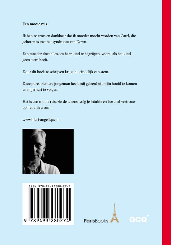 Een mooie reis. Ik ben zo trots en dankbaar dat ik moeder mocht worden van Carel, die geboren is met het syndroom van Down. Een moeder doet alles om haar kind te begrijpen, vooral als het kind geen stem heeft. Door dit boek te schrijven krijgt hij eindelijk een stem. Deze pure, pientere jongeman heeft mij geleerd uit mijn hoofd te komen en mijn hart te volgen. Het is een mooie reis, zie de tekens, volg je intuïtie en bovenal vertrouw op het universum. www.hierisangelique.nl