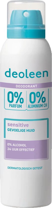 Deoleen deodorant 0% aluminium Sensitive spray bevat géén aluminium (ACH), alcohol, parfum en laat geen witte strepen achter op je kleding