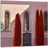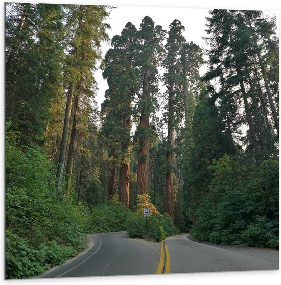 Dibond - Hoge Groene Bomen Langs de Weg - 50x50cm Foto op Aluminium (Wanddecoratie van metaal)
