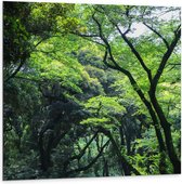 Dibond - Hoge bomen in het Bos - 100x100cm Foto op Aluminium (Wanddecoratie van metaal)