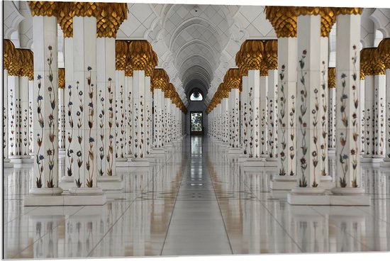Dibond - Pilaren met Gouden Details in Witte Tempel - 90x60 cm Foto op Aluminium (Met Ophangsysteem)