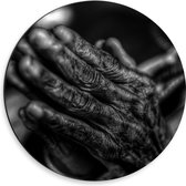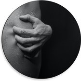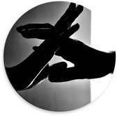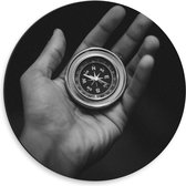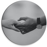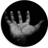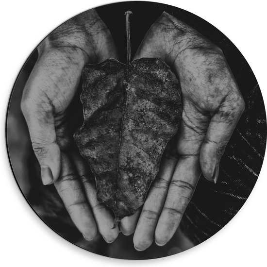 Dibond Wandcirkel - Zwart/Wit Hand Met een Blaadje - 30x30cm Foto op Aluminium Wandcirkel (met ophangsysteem)
