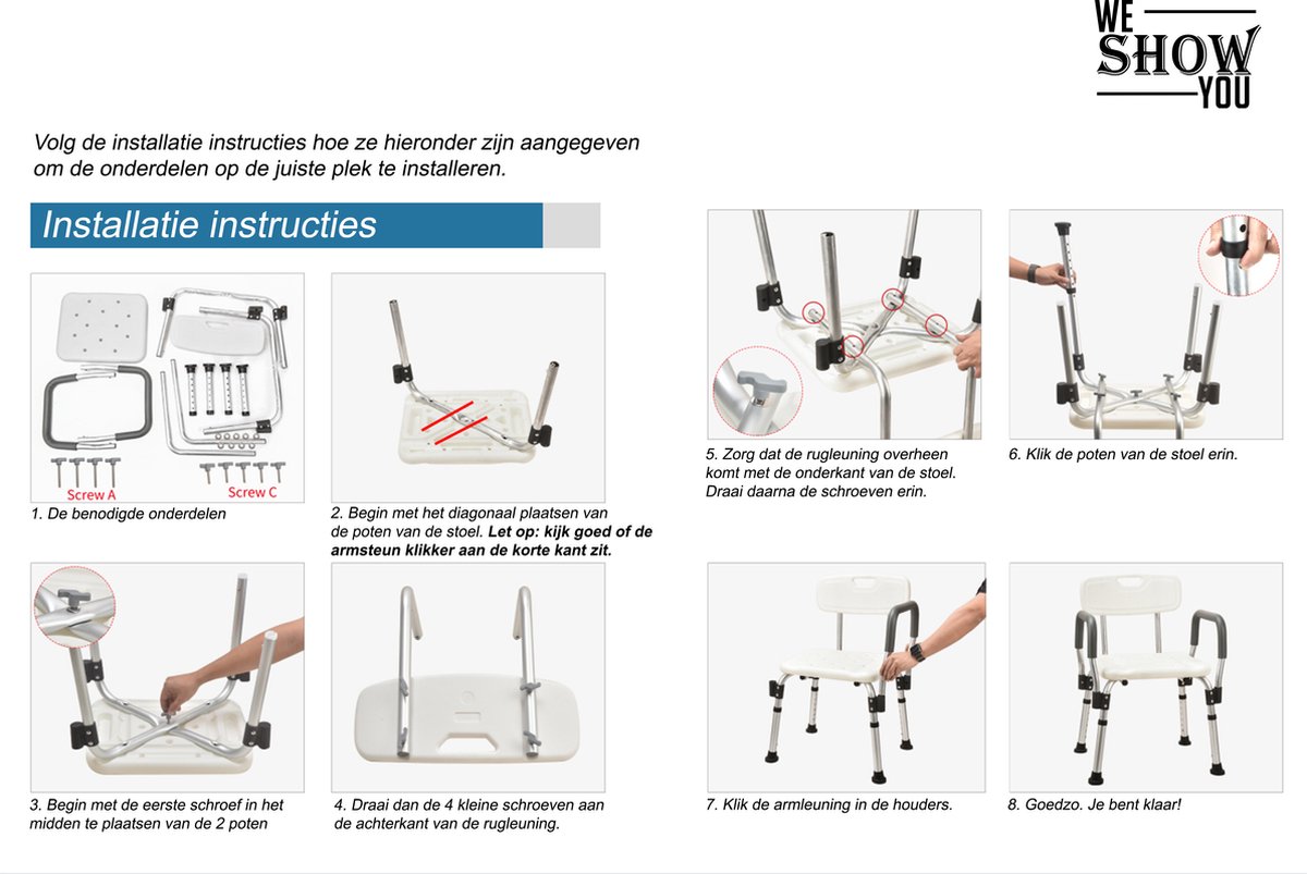 Wat er wordt meegeleverd als je dit product bestelt. - Verpakkingsinhoud: Martii Douchestoel – Ultieme Veiligheid en Comfort Onder de Douche Wanneer u de verpakking van uw nieuwe Martii Douchestoel opent, begint u aan een reis naar een veiligere en comfortabelere douche-ervaring. Deze zorgvuldig samengestelde verpakking bevat alles wat u nodig heeft om te genieten van een superieur comfort onder de douche met gemak en veiligheid. Douchestoel Frame: In de verpakking vindt u het hoofdframe van de Martii Douchestoel. Het frame is vervaardigd uit hoogwaardige materialen die zorgen voor een optimale duurzaamheid en stabiliteit. De constructie is ontworpen om een gewicht tot 136 kg te dragen en biedt een veilige en stevige ondersteuning. Afneembare Rugleuning: Een gevoerde rugleuning biedt extra comfort tijdens het douchen. Deze is afneembaar, zodat u de stoel naar wens kunt aanpassen. De rugleuning heeft een antislipstructuur, die de veiligheid verhoogt door te voorkomen dat u wegglijdt. Afneembare Armleuningen: De set bevat ook twee gevoerde, afneembare armleuningen. Deze zijn cruciaal voor extra ondersteuning en helpen bij het opstaan en gaan zitten. De armleuningen kunnen eenvoudig worden verwijderd met een kliksysteem voor momenten waarop u ze niet nodig heeft. Verstelbare Poten met Antislip Doppen: Vier verstelbare poten, voorzien van rubberen antislipdoppen, zorgen ervoor dat de stoel stevig op zijn plaats blijft. Deze poten zijn in zes verschillende hoogtes verstelbaar, waardoor u de zithoogte naar uw behoeften kunt aanpassen. Zitvlak: Een ergonomisch ontworpen zitvlak verhoogt het comfort en de ondersteuning. Het is voorzien van een anti-slip structuur en unieke micro-drainagegaten, die water afvoeren terwijl u zit en het risico op uitglijden verminderen. Montage-accessoires en Handleiding: U vindt een set easy-grip schroeven en andere montage-accessoires, samen met een duidelijke stap-voor-stap handleiding. Dit maakt de montage van de douchestoel eenvoudig en zonder de noodzaak van gereedschap.