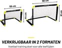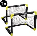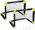 Daag elkaar uit met een partijtje voetbal of verbeter je scoringskansen met deze set van 2 opvouwbare mini-voetbalgoals van Dunlop. Je hebt ze met het kliksysteem zo opgezet. De 4 meegeleverde grondpinnen zorgen dat de goals stevig staan. De goals zijn gemaakt van polypropyleen, een stevig kunststof. Ze zijn grotendeels zwart met felgele details op de hoeken.