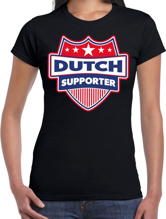 Nederland / Dutch vlag kleuren schild thema, supporters t-shirt, in het zwart, voor dames. Op dit t-shirt staat een schild met de tekst: Dutch supporter. Het schild heeft de kleuren van de vlag van het land. Dit t-shirt is leuk om cadeau te geven aan iemand die naar Nederland gaat of fan / supporter is van Nederland of een sport elftal. Materiaal: 150 grams, 100% katoen. Landen thema kleding.