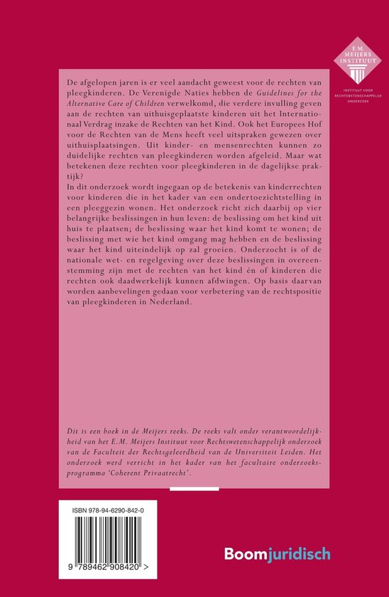 De afgelopen jaren is er veel aandacht geweest voor de rechten van pleegkinderen. De Verenigde Naties hebben de Guidelines for the Alternative Care of Children verwelkomd, die verdere invulling geven aan de rechten van uithuisgeplaatste kinderen uit het Internationaal Verdrag inzake de Rechten van het Kind. Ook het Europees Hof voor de Rechten van de Mens heeft veel uitspraken gewezen over uithuisplaatsingen. Uit kinder- en mensenrechten kunnen zo duidelijke rechten van pleegkinderen worden afgeleid. Maar wat betekenen deze rechten voor pleegkinderen in de dagelijkse praktijk? In dit onderzoek wordt ingegaan op de betekenis van kinderrechten voor kinderen die in het kader van een ondertoezichtstelling in een pleeggezin wonen. Het onderzoek richt zich daarbij op vier belangrijke beslissingen in hun leven: de beslissing om het kind uit huis te plaatsen; de beslissing waar het kind komt te wonen; de beslissing met wie het kind omgang mag hebben en de beslissing waar het kind uiteindelijk op zal groeien. Onderzocht is of de nationale wet- en regelgeving over deze beslissingen in overeenstemming zijn met de rechten van het kind én of kinderen die rechten ook daadwerkelijk kunnen afdwingen. Op basis daar van worden aanbevelingen gedaan voor verbetering van de rechtspositie van pleegkinderen in Nederland.