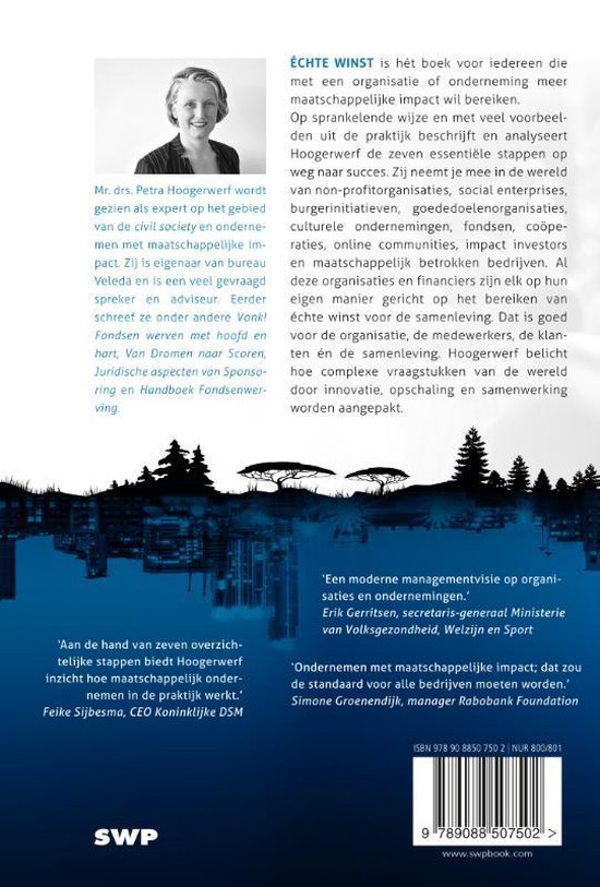 Elke organisatie wil tevreden klanten, een goed imago en gemotiveerde medewerkers. Dat kan als je het Échte winst denken invoert. Klanten, investeerders en medewerkers vragen steeds meer om maatschappelijke betrokkenheid. Alleen op winst gericht zijn is allang passé. Ondernemen met impact staat nog in de kinderschoenen, maar zal absoluut de norm worden. Het gaat volgens Hoogerwerf niet alleen om goede intenties, het gaat om echte winst: klinkende resultaten die het leven verbeteren, van medewerkers, klanten, de leveranciers en ook in de samenleving.
