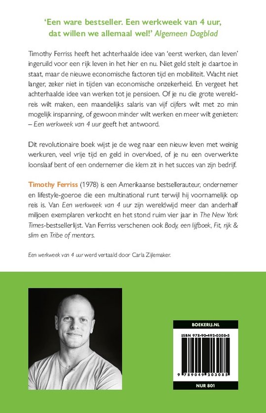 Vraag Timothy Ferriss wat hij aan het doen is, en de kans is groot dat je als antwoord krijgt: ‘skiën in de Andes’, ‘duiken in Panama’ of ‘tangodansen in Buenos Aires’. Ferriss heeft namelijk het achterhaalde idee van ‘eerst werken, dan leven’ ingeruild voor een rijk leven in het hier en nu. Niet geld stelt je daartoe in staat, maar de nieuwe economische factoren tijd en mobiliteit.