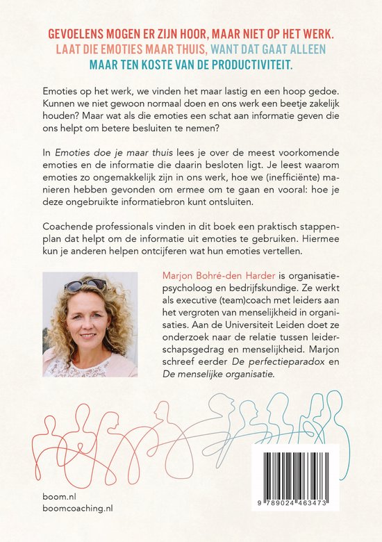 In Emoties doe je maar thuis lees je over de meest voorkomende emoties en de informatie die daarin besloten ligt. Je leest waarom emoties zo ongemakkelijk zijn in ons werk, hoe we (inefficiënte) manieren hebben gevonden om ermee om te gaan en vooral: hoe je deze ongebruikte informatiebron kunt ontsluiten.