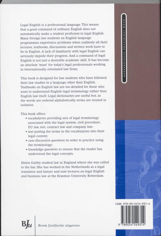 Legal English is a professional language. This means that a good command of ordinary English does not automatically make a student proficient in legal English. Many foreign law students in English language programs experience problems when suddenly all their lectures, textbooks, discussions, and written work have to be in English. A lack of familiarity with legal English can seriously impede their progress. And a command of legal English is not just a desirable academic skill. It has become an absolute must for today's legal professionals working in internationally orientated law firms. The book is designed for law students who have followed their law studies in a language other than English. Textbooks on English law are too detailed for those who want to understand English legal terminology rather than English law itself. Legal dictionaries are useful but, as the words are ordered alphabetically, terms are treated in isolation. This book offers: vocabulary providing sets of legal terminology associated with the legal system, civil procedure, EU law, tort law, contract law, and company law --- text that puts the terms into their legal context --- case discussion questions for practicing the use of terminology --- knowledge questions to ensure the understanding of the legal concepts