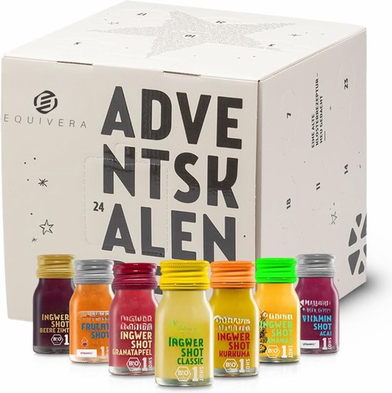 De Equivera Premium Adventskalender 2024 biedt je 24 verrassingen, zorgvuldig gevuld met heerlijke gembershots in zeven verschillende smaken! Deze kalender is perfect voor zowel nieuwe als trouwe fans van gemberdranken. In plaats van chocolade, ontvang je een dagelijkse dosis superfood om de feestdagen op een gezonde manier te vieren!