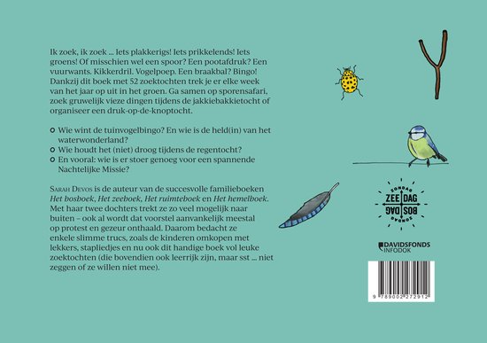 Toch ben ik, tot hier toe (je weet maar nooit), giga fan van alles dat Sarah al heeft gemaakt. Zoals van dit boek, dat dus geen boek is. Wat is het dan wel? Het is een bundeling van 52 (alé 51, nummer 52 mag je zelf verzinnen) zoektochten om mee te nemen als je op pad gaat. Je kan ze makkelijk uitscheuren langs de perforatierand of je laat je boek heel (daarvoor is het een boek met ringetjes op de rug).