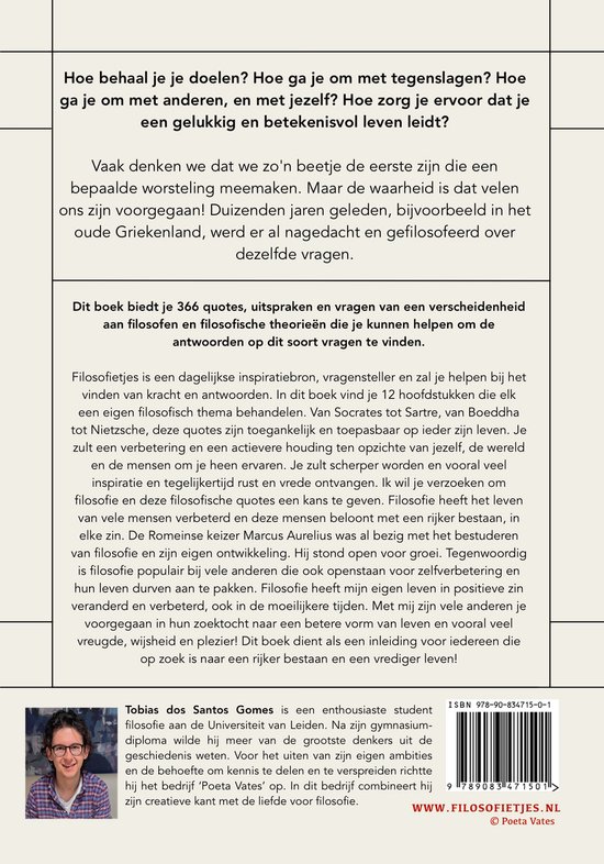 Ik heb het boek Filosofietjes al meerdere keren cadeau gedaan en de reacties waren telkens geweldig! Het eerste wat iedereen doet, is hun eigen verjaardag opzoeken, en dat moment is altijd bijzonder. De tekst past vaak verrassend goed bij hun persoonlijkheid, wat het cadeau nog persoonlijker maakt. Het boek zit vol inspiratie en wijsheden die mensen aan het denken zetten. Echt een aanrader als je op zoek bent naar een origineel en betekenisvol cadeau!
