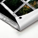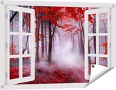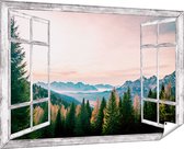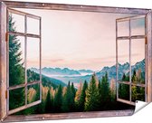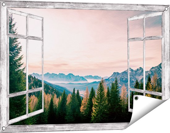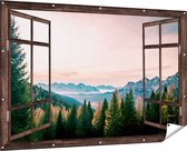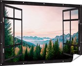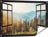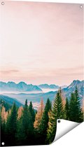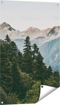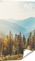 Gards Tuinposter Doorkijk Bos met Bomen bij Bergen Landschap - 90x60 cm - Tuindoek - Tuindecoratie - Wanddecoratie buiten - Tuinschilderij