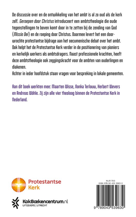 In ‘Geroepen door Christus’ zetten vier theologen lezers aan tot het nadenken over de theologie van het ambt en nodigen ze lokale gemeenten uit tot reflectie aan de hand van praktische vragen. De discussie over en de ontwikkeling van het ambt is al zo oud als de kerk zelf. Geroepen door Christus introduceert een ambtstheologie die oude tegenstellingen te boven komt door in te zetten bij de zending van God (Missio Dei) en de roeping door Christus. Daarmee levert het een doorwrochte protestantse bij drage aan het oecumenische debat over het ambt. Ook helpt het de Protestantse Kerk verder in de positionering van pioniers en kerkelijk werkers als ambtsdragers.