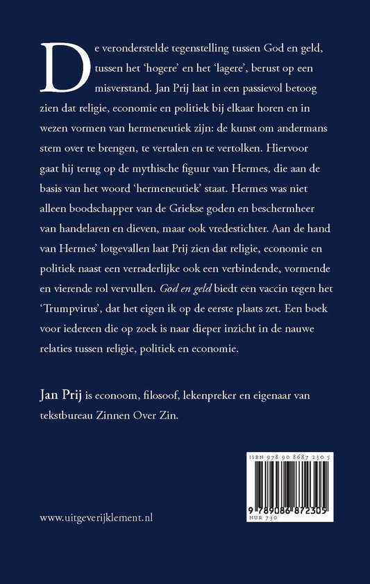 Jan Prij is econoom, filosoof en lekenpreker. Hij laat zien hoe religie, economie en politiek met elkaar verbonden zijn en geeft zijn visie op deze drie aspecten van het leven vanuit bovenstaand gezichtspunt. De Griekse god Hermes vormt de rode draad. In hem komen religie, economie en politiek bij elkaar. De hermeneutiek is met zijn naam verbonden. Zij staat voor het overbrengen, vertalen en interpreteren van andermans gedachten. Dit is volgens Prij de essentie van religie, economie en politiek. De hermeneutische kern van religie is dat zij hemel en aarde met elkaar probeert te verbinden. De economie staat in het teken van het verbinden van inspirerende idealen en de aardse werkelijkheid van alledag. Bij de politiek gaat het om het vermogen om vrede te stichten en het goede leven mogelijk te maken.