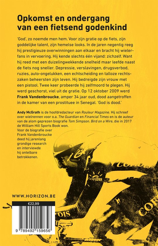 'God', zo noemde men hem. Voor zijn bovenaardse talent, zijn hemelse looks. Hij reeg de overwinningen aan elkaar en bracht wielerfans in vervoering. Hij kende slechts één vijand: zichzelf. Want hij reed met duizelingwekkende snelheid maar leefde naast de fiets nog sneller. Depressie, verslavingen, auto-ongelukken, een echtscheiding en talloze rechtszaken beheersten zijn leven. Twee keer probeerde hij zelfmoord te plegen. Hij werd geschorst, viel uit de gratie. Op 12 oktober 2009 werd Frank Vandenbroucke, amper 34 jaar, dood aangetroffen in de kamer van een prostituee in Senegal. 'God is dood.'